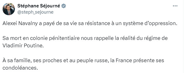 "Олексій Навальний пожертвував своїм життям, щоб протистояти системі гноблення. Його смерть у виправній колонії нагадує нам про реальність режиму Володимира Путіна. Франція висловлює співчуття його родині та друзям, а також російському народу", - зазначив Сежурне.