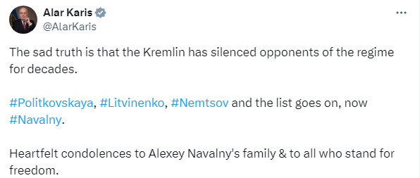 Естонський лідер Алар Каріс також підкреслив, що Кремль "десятиліттями примушував мовчати опонентів режиму". Він згадав і інших жертв режиму в РФ - Анну Політковську, Олександра Литвиненка, Бориса Нємцова. Каріс висловив співчуття родині Навального та "всім, хто бореться за свободу".