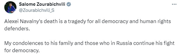 Очільниця Грузії Саломе Зурабішвілі наголосила, що смерть Навального – "трагедія для всіх захисників демократії та прав людини". "Мої співчуття його родині та тим, хто в Росії продовжує боротьбу за демократію", – додала вона.