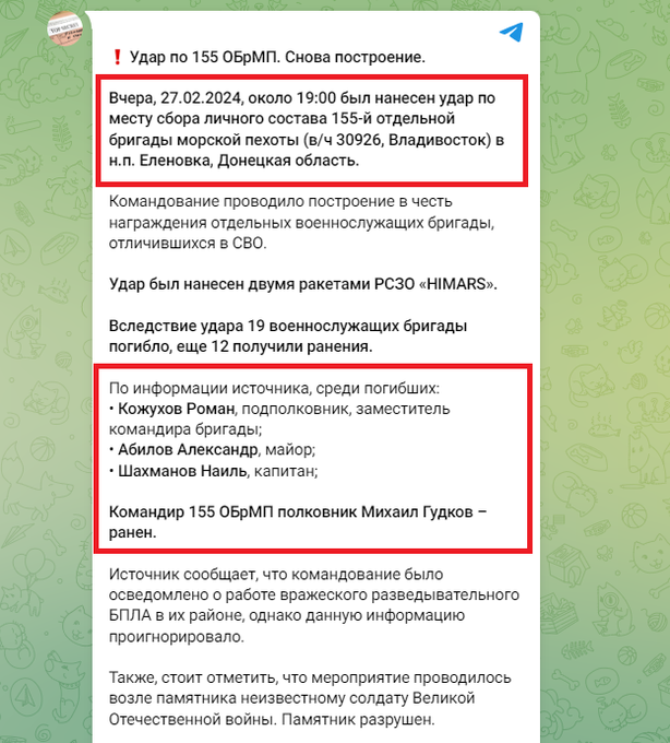 "Збройні Сили України завдали ракетного удару по скупченню російських військ в Оленівці Донецької області за допомогою українських реактивних систем залпового вогню", - йдеться в повідомленні.