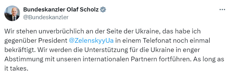 "Ми непохитно стоїмо на боці України, я це підтвердив президенту України Володимиру Зеленському ще раз у телефонній розмові. Ми продовжимо підтримувати Україну в тісній координації з нашими міжнародними партнерами. Так довго, як це буде потрібно", - зазначив канцлер.