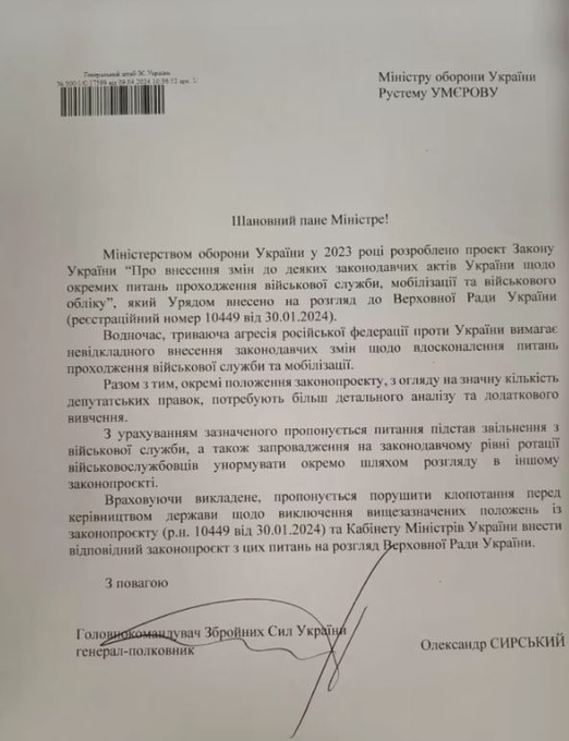 У виданні пишуть, що виключення питання демобілізації із законопроєкту ініціював головнокомандувач Збройних сил України Олександр Сирський.