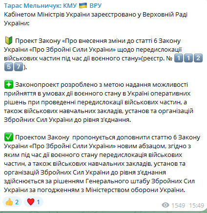 "Кабінетом міністрів України зареєстровано у Верховній Раді України проєкт Закону "Про внесення зміни до статті 6 Закону України "Про Збройні сили України" щодо передислокації військових частин під час дії воєнного стану" (реєстр. №11257). Законопроєкт розроблено з метою надання можливості прийняття в умовах дії воєнного стану в Україні оперативних рішень при проведенні передислокації військових частин, а також військових навчальних закладів, установ та організацій Збройних сил України до рівня з’єднання", - повідомив Мельничук.