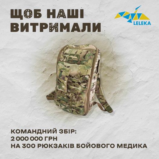 "Забезпеч 300 бойових медиків якісними наплічниками - підтримай збір на 2 000 000 грн! Leleka Foundation/БФ Лелека-Україна готує 300 бойових медиків до важкого літа: маємо укомплектувати й передати на фронт три сотні спеціальних наплічників", - йдеться у повідомленні.