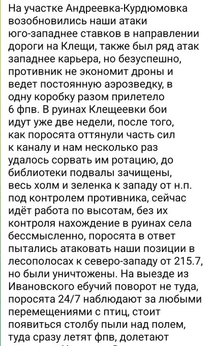 Українські воїни завдають окупантам відчутних втрат, активно застосовують засоби вогневого ураження по живій силі ворога та техніці. Здійснюють заходи щодо покращення тактичного положення, за можливості рухаються вперед, витісняючи російських окупантів з їх позицій.