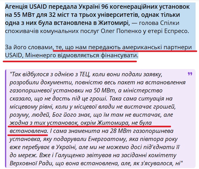 Агенція USAID передала Україні 96 когенераційних установок на 55 МВт для 32 міст та трьох університетів, але Міненерго відмовляється фінансувати їх встановлення - голова Спілки споживачів комунальних послуг О.Попенко.