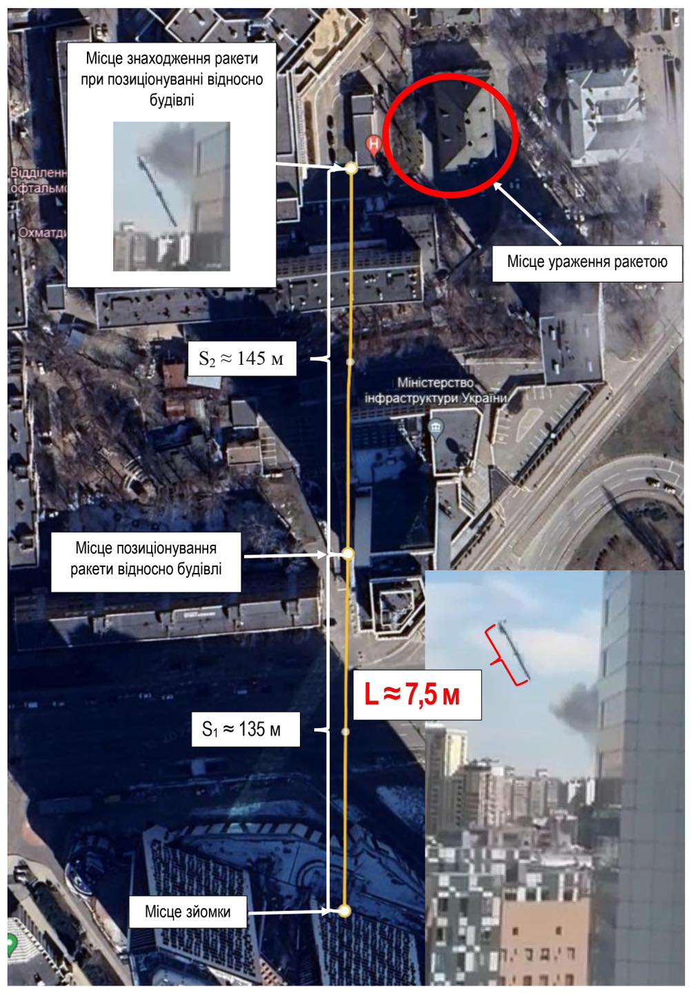 Також за наявним у розпорядженні експертів КНДІСЕ відео влучання ракети в дитячу лікарню "Охматдит", зроблено орієнтовний розрахунок розміру крилатої ракети – 7,5 метра.
