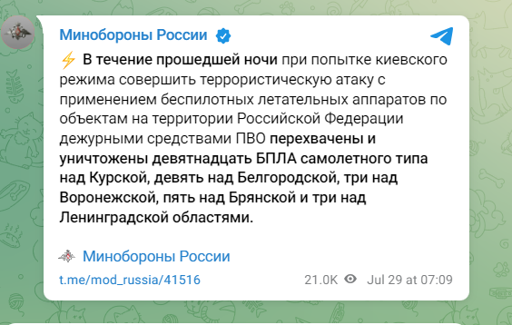 Губернатор Орловської області оголосив, що над південною частиною області збито два українські безпілотники, і при цьому пошкоджено електростанцію.