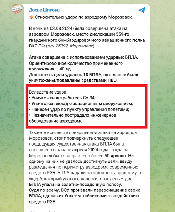 Напередодні Генштаб повідомив, що у ніч на 3 серпня Сили оборони завдали удару по аеродрому "Морозовськ" (Ростовська область, РФ). Зокрема, повідомлялося про влучання в склади з боєприпасами, де серед іншого окупанти зберігали і керовані авіаційні бомби.