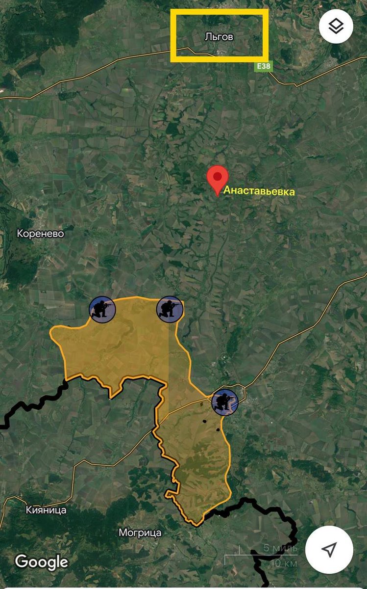 "488 мотострелковый полк РФ,который должен был развернуться для обороны в районе севернее Суджи был рассеян на марше в районе населенного пункта Анастасьевка. Это чуть больше 30 км до Курской АЭС. Полковник Владимир Корало(командир) на связь не выходит."