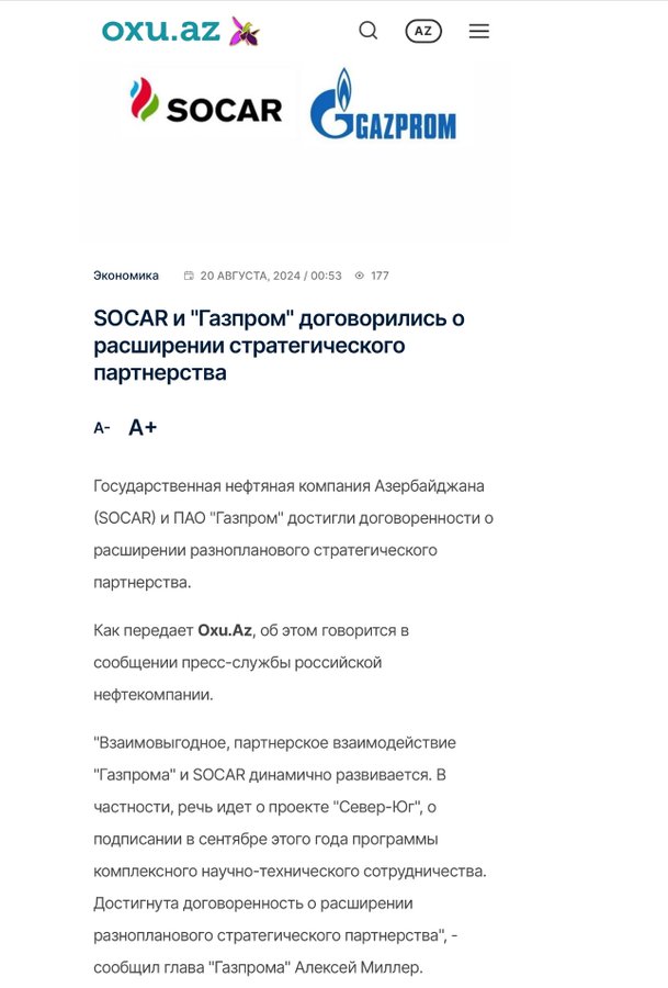 Державна азербайджанська нафтова компанія «SOCAR» розширила партнерство з російським «Газпромом». Рішення було прийнято в ході візиту путіна до Азербайджану та зустрічі з президентом Алієвим.