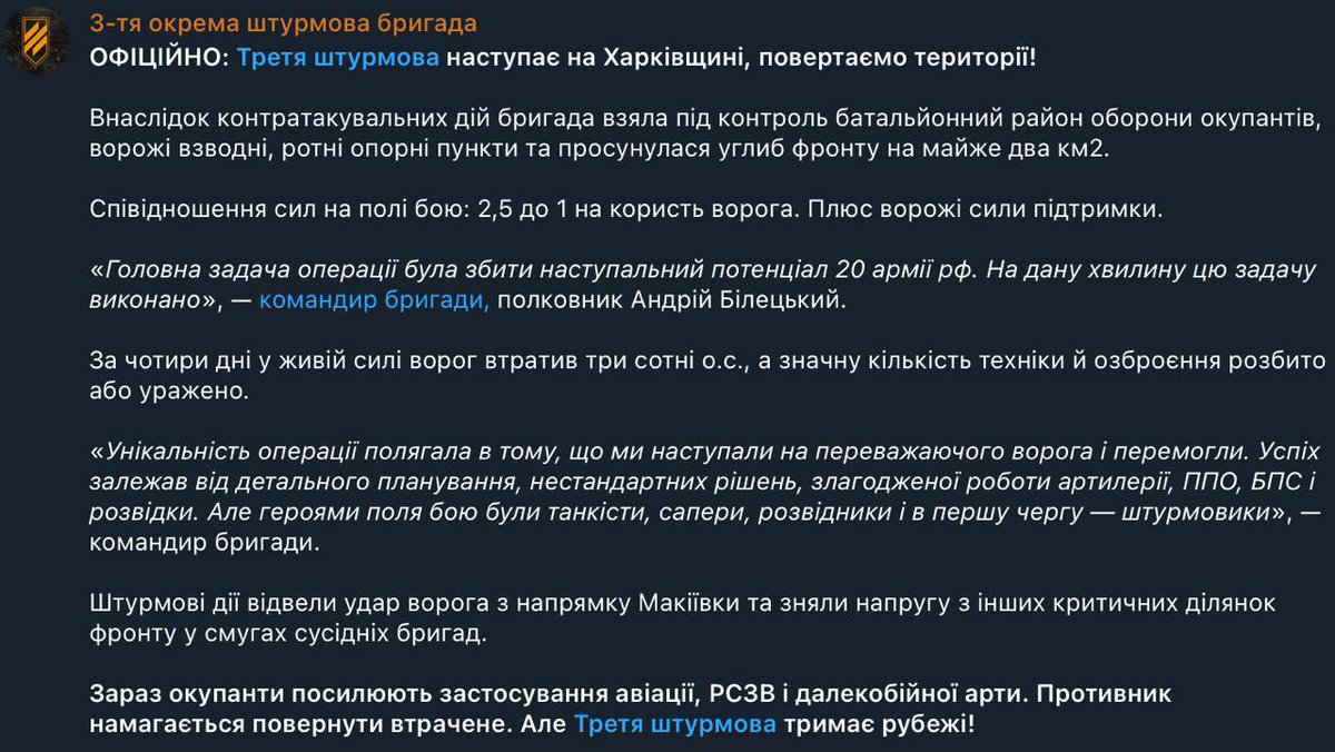 "ОФІЦІЙНО: Третя штурмова наступає на Харківщині, повертаємо території!" - йдеться в повідомленні.