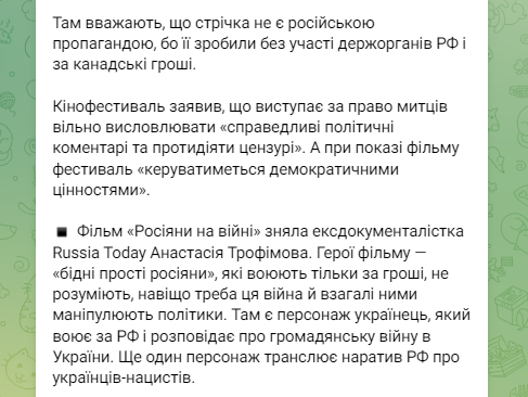 Нагадаємо, канадська медіаорганізація TVO (TV Ontario), через яку надали фінансування виробництва фільму "Росіяни на війні" російської режисерки Анастасії Трофімової, вирішила надалі не демонструвати його.