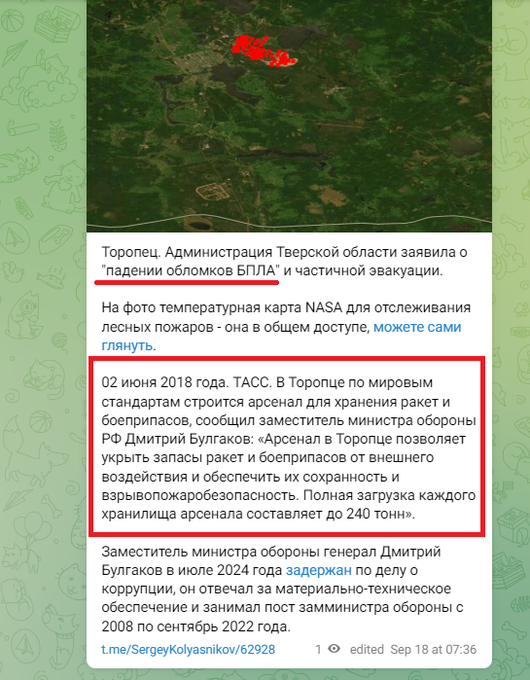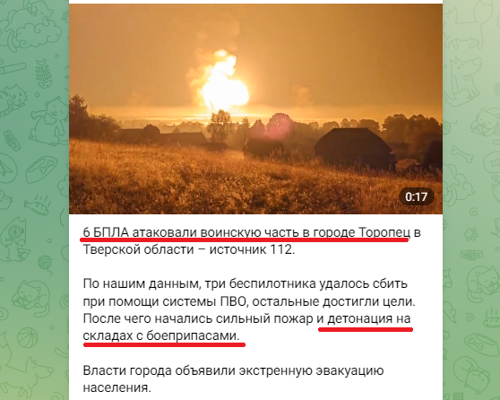 У ніч проти середи, 18 вересня, у Тверській області РФ лунали потужні вибухи. Місцева влада повідомила про пожежу та евакуацію населення.