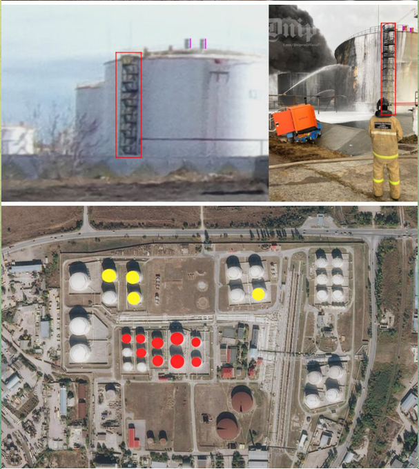На знімках з супутника Planet Labs, які було зроблено 11 жовтня, видно наслідки атаки безпілотників по складах неподалік міста Єйськ.