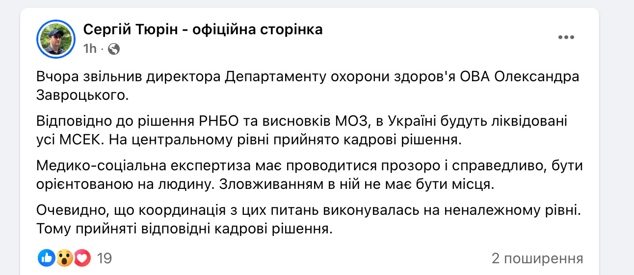 "Вчора звільнив директора Департаменту охорони здоров'я ОВА Олександра Завроцького. Відповідно до рішення РНБО та висновків МОЗ, в Україні будуть ліквідовані усі МСЕК. На центральному рівні прийнято кадрові рішення", - зазначив Тюрін.