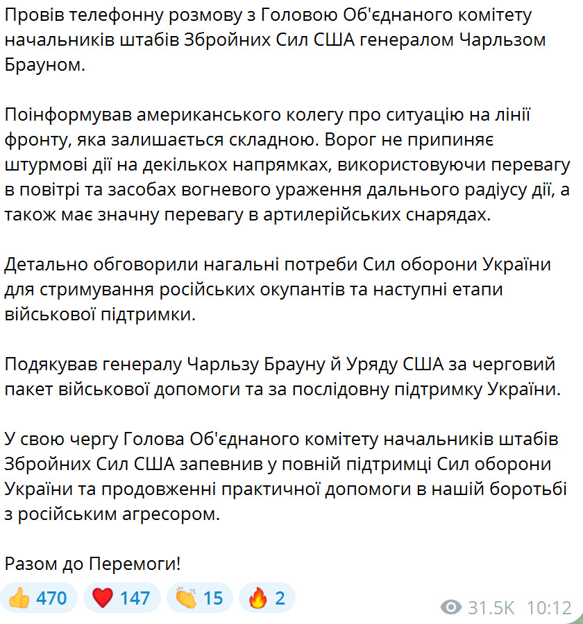 У свою чергу Голова Об'єднаного комітету начальників штабів Збройних Сил США запевнив у повній підтримці Сил оборони України та продовженні практичної допомоги в нашій боротьбі з російським агресором", - розповів Сирський.