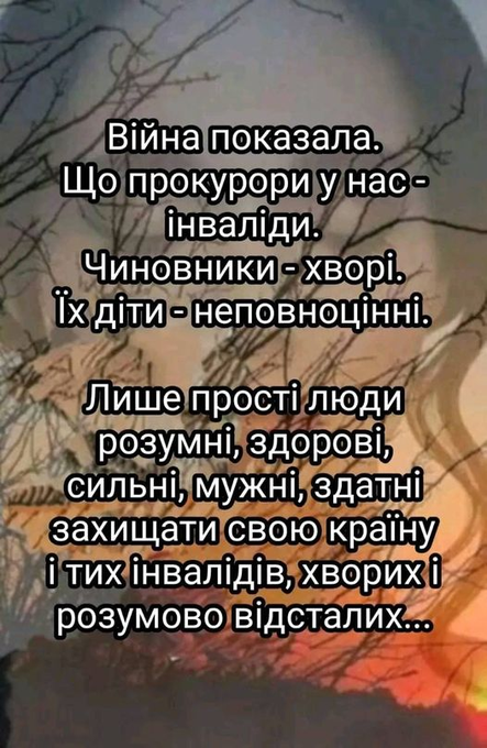 Ну і винні у всьому ухилянти, які "здорові" і нічого не мають, які це все бачать, і не хочуть захищати оцю всю інвалідну махіну казнокрадів. Вибачте, але як є.