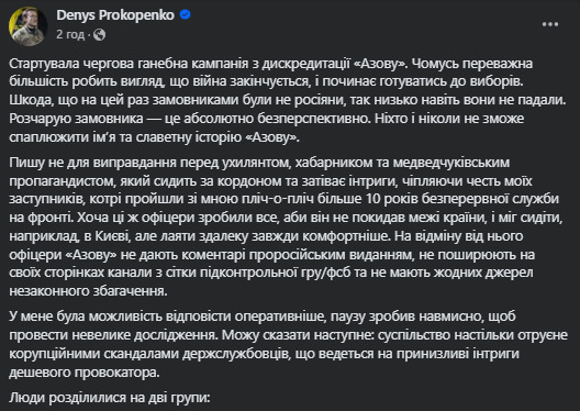 "Стартувала чергова ганебна кампанія з дискредитації "Азову". Чомусь переважна більшість робить вигляд, що війна закінчується, і починає готуватись до виборів. Шкода, що на цей раз замовниками були не росіяни, так низько навіть вони не падали. Розчарую замовника — це абсолютно безперспективно. Ніхто і ніколи не зможе спаплюжити імʼя та славетну історію "Азову", - написав Прокопенко.