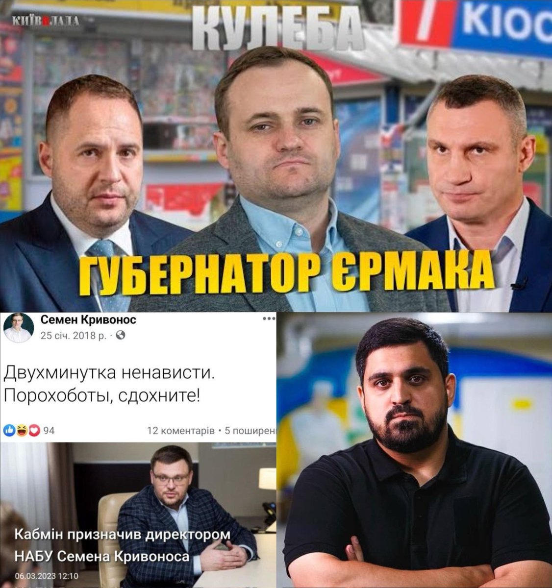 шоу?Новий голова КМВА Тимур Ткаченко є кумом голови НАБУ Семена Кривоноса та екс бізнес-партнером Олексія Кулеби по ТОВ Аспер Естейт. Ткаченко орендував квартиру в дружини Кривоноса, а Кривонос орендував в дружини Ткаченка Ауді q5. Ткаченко, Кривонос і Кулеба є призначенцями Єрмака
