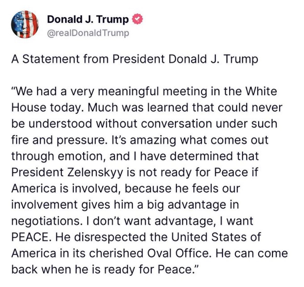 "Сьогодні у Білому домі відбулася дуже змістовна зустріч. Було отримано багато важливої інформації, яку неможливо зрозуміти без розмови в таких складних умовах тиску. Дивовижно, які речі розкриваються через емоції, і я дійшов висновку, що Президент Зеленський не готовий до миру, якщо у цьому бере участь Америка, оскільки він вважає, що наша участь дає йому велику перевагу у переговорах. Я не хочу переваги, я хочу МИРУ. Він виявив неповагу до Сполучених Штатів Америки в їхній священній Овальній залі. Він може повернутися, коли буде готовий до миру."