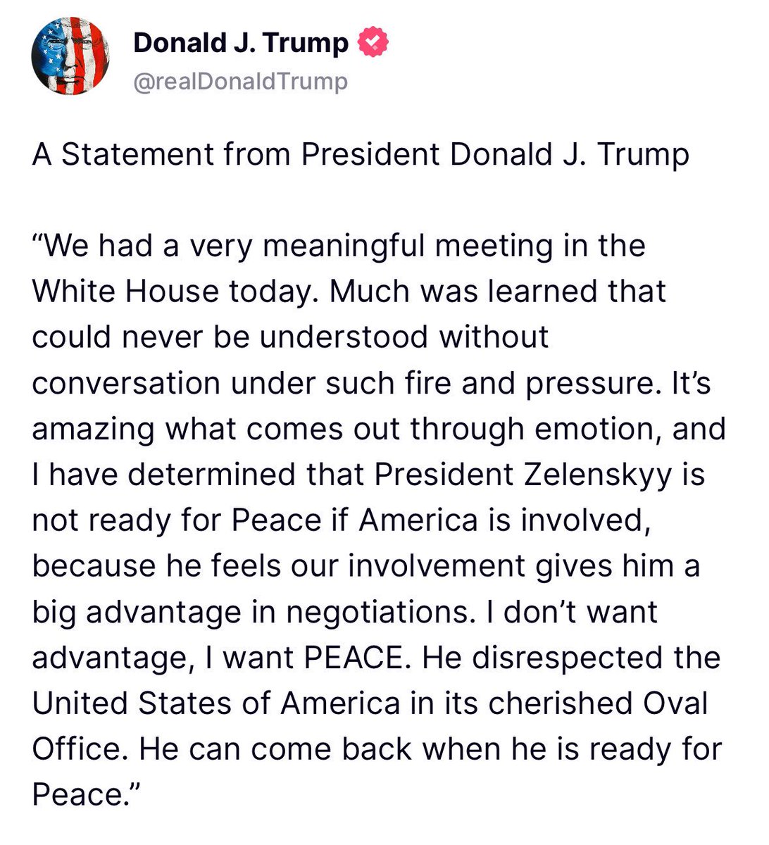 Анализ Заявления Трампа, а он заявил: «Сегодня у нас была очень значимая встреча в Белом доме. Мы узнали много такого, чего никогда нельзя было бы понять без разговора под таким огнем и давлением. Удивительно, что выходит через эмоции, и я определил, что президент Зеленский не готов к миру, если в этом будет участвовать Америка, потому что он чувствует, что наше участие дает ему большое преимущество в переговорах. Мне не нужно преимущество, мне нужен МИР. Он проявил неуважение к Соединенным Штатам Америки в их заветном Овальном кабинете. Он может вернуться, когда будет готов к миру».