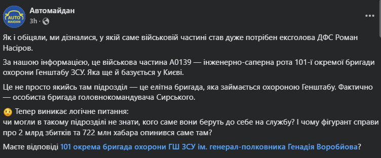 Тепер виникає логічне питання: чи могли в такому підрозділі не знати, кого саме вони беруть до себе на службу? І чому фігурант справи про 2 млрд збитків та 722 млн хабара опинився саме там?", - ідеться у дописі.