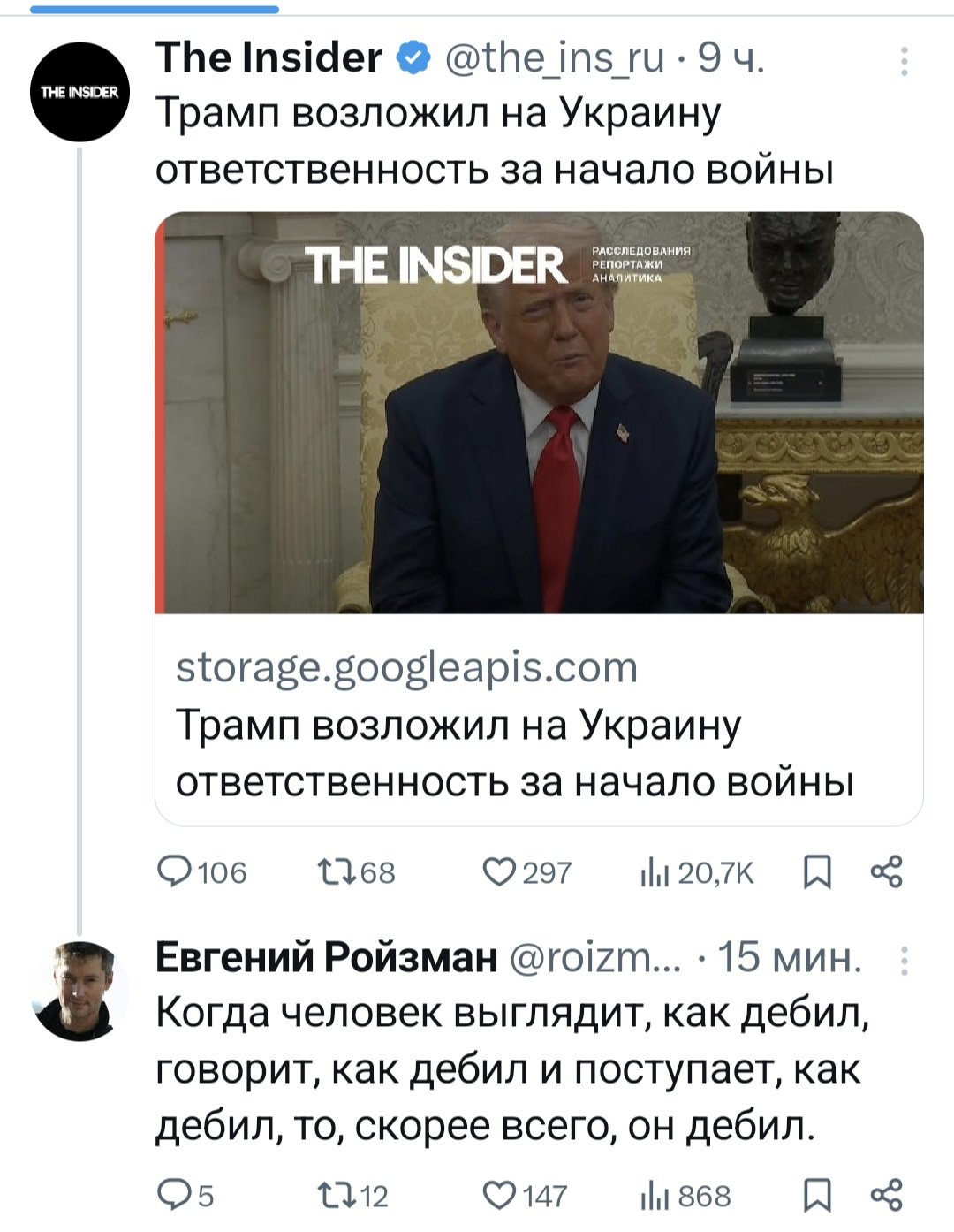 "Війна між Росією та Україною - це війна Байдена, а не моя. Я тільки-но прийшов до влади, і протягом чотирьох років свого терміну не мав жодних проблем із тим, щоб не допустити її початку. Президент Путін та всі інші поважали вашого Президента! Я не маю жодного відношення до цієї війни, але працюю наполегливо, щоб припинити смерті та руйнування.