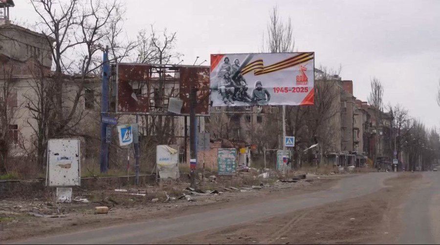 Знаете, где сделано фото? Это украинский Бахмут. Россия уничтожила город, а теперь среди мёртвых руин, в которых, вероятно, всё ещё лежат убитые мирные люди, развешивает победобесные плакаты. Эта картинка - это и есть "русский мир".