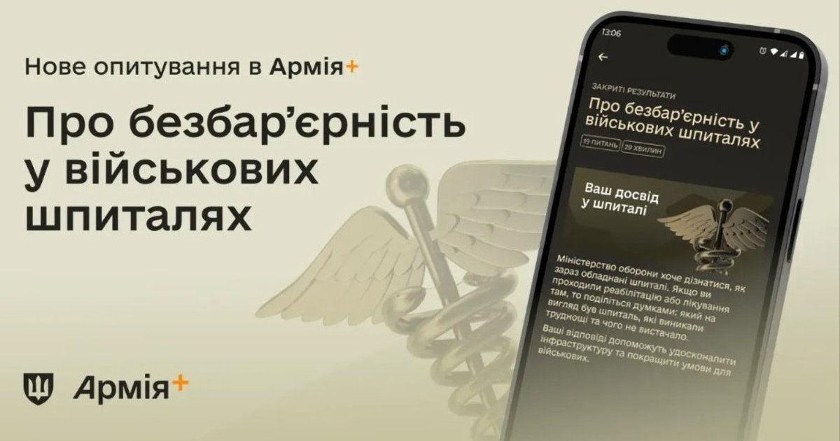 У застосунку Армія+ запустили нове опитування, що стосується стану забезпечення безбар'єрного простору у військових шпиталях.