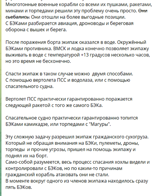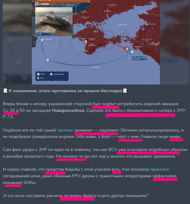 "Cамолеты вынуждены подходить к катерам практически в упор, неизбежно попадая под огонь ПЗРК, ЗРК и дистанционно управляемых пулеметов", - пише автор каналу.