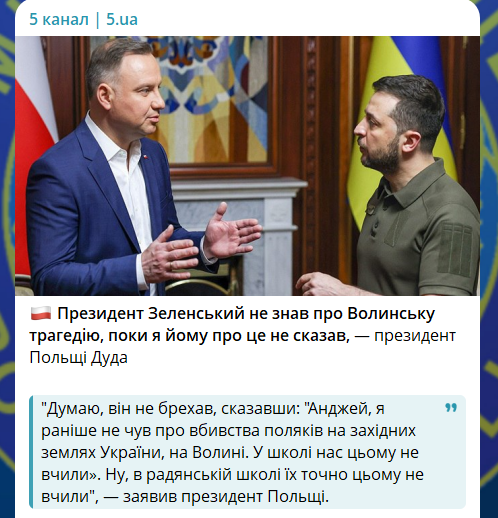 "Жертви волинського геноциду заслуговують на гідне поховання, а їхні родини, що вижили, мають право молитися на могилах своїх близьких. Тому я послідовно вимагаю від української влади системного вирішення питання дозволів на пошук та ексгумацію жертв волинського геноциду. Примирення може ґрунтуватися лише на правді", - заявив новообраний президент Польщі.