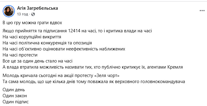 "В цю гру можна грати вдвох. Якщо прийняття та підписання 12414 на часі, то і критика влади на часі. На часі корупційні викриття. На часі політична конкуренція та опозиція. На часі обʼєктивно оцінювати неефективність наближених. На часі протести. Все це за один день стало на часі", - пише вона.