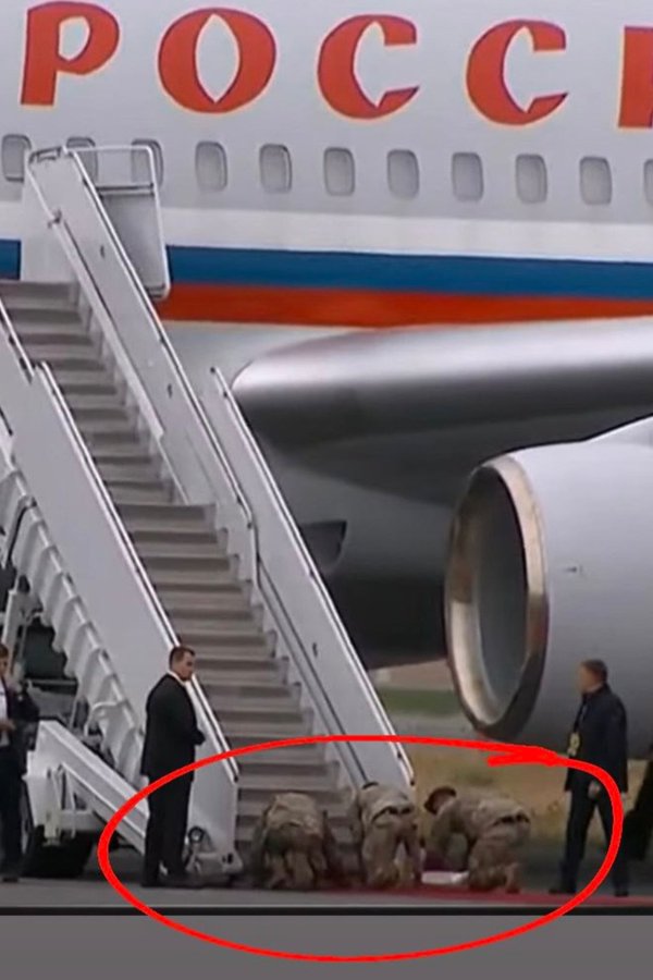 Супровід літака Путіна з американськими винищувачами F-22, червона доріжка після прибуття, зустріч біля гелікоптера Трампа, рукостискання, вшанування американських військових, повітряний парад, порушення дипломатичної ізоляції, легіти