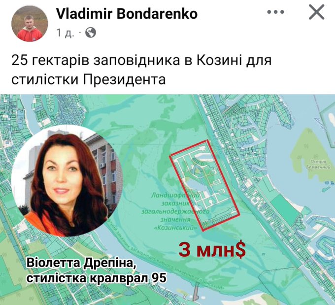 У листопаді 2023 року на торгах ДП "СЕТАМ" АТ "ЗНВКІФ "МОНОЛІТ" Дрепіна купив у державного Укрексімбанку земельну ділянку площею 25 гектарів (31 ділянка) які знаходяться за адресою Київська область, Обухівський район, с. Козин в межах ландшафтного заказника Загальнодержавного значення "Козинський". Ціна 119 млн грн ($3 млн, тобто по $120 тис за гектар). Але це вже інша історія", - підсумував Бондаренко.