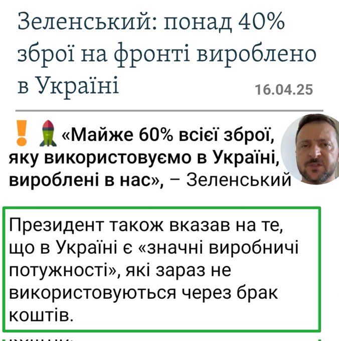 "Це буде виробництво компонентів для наших ракет, для наших дронів – зброї, яка вже дуже добре проявляє себе. За час цієї війни Україна вже вийшла на показник: майже 60 % зброї, яка в нас є, яка в наших воїнів, – це українська зброя, і це сильна зброя, багато передових речей", - заявив президент.