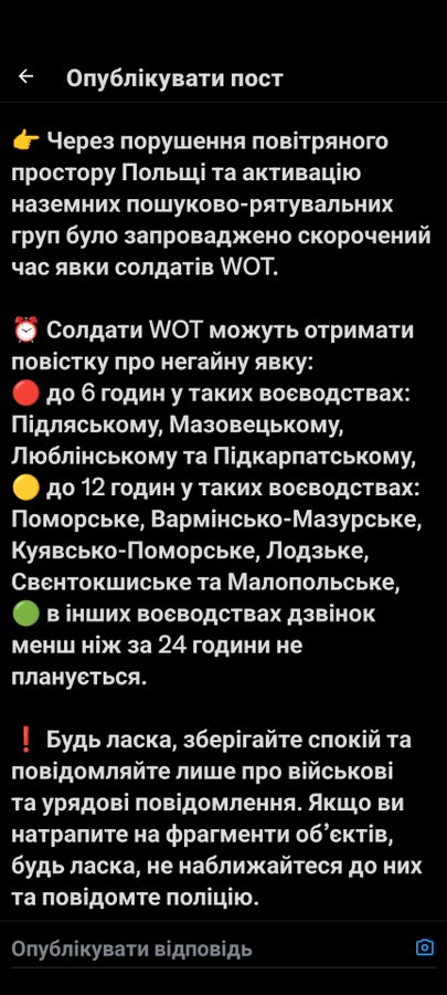 W związku z naruszeniem polskiej przestrzeni powietrznej i uruchomieniem naziemnych zespołów poszukiwawczo-ratowniczych wprowadzono skrócony czas stawiennictwa dla żołnierzy WOT. Żołnierze WOT mogą otrzymać wezwanie do natychmiastowego stawiennictwa: do 6 h w województwach: podlaskim, mazowieckim, lubelskim i podkarpackim, do 12 h w województwach: pomorskim, warmińsko-mazurskim, kujawsko-pomorskim, łódzkim, świętokrzyskim i małopolskim, w czasie krótszym niż 24h wezwanie w pozostałych województwach nie jest planowane. Prosimy o zachowanie spokoju oraz przekazywanie tylko komunikatów wojska i służb państwowych. W przypadku natrafienia na fragmenty obiektów prosimy nie podchodzić do nich i poinformować policję.
