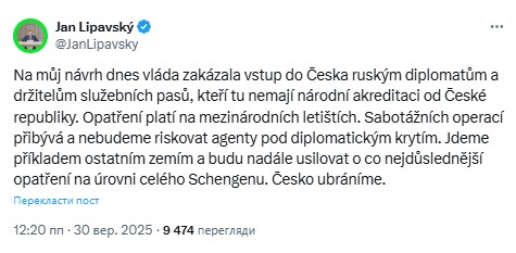 "За моєю пропозицією уряд сьогодні заборонив в'їзд до Чеської Республіки російським дипломатам та власникам службових паспортів, які не мають національної акредитації Чеської Республіки. Цей захід стосується міжнародних аеропортів", – йдеться в повідомленні.