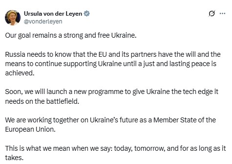"Росія повинна знати, що ЄС та його партнери мають волю та засоби продовжувати підтримувати Україну, доки не буде досягнуто справедливого та тривалого миру. Незабаром ми запустимо нову програму, щоб надати Україні технологічну перевагу, необхідну на полі бою", - написала фон дер Ляєн.