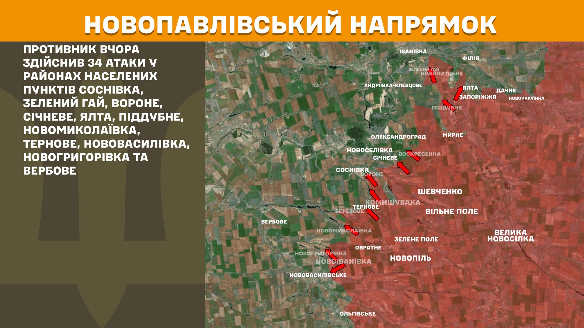 За даними Генштабу, на Новопавлівському напрямку противник вчора здійснив 34 атаки у районах населених пунктів Соснівка, Зелений Гай, Вороне, Січневе, Ялта, Піддубне, Новомиколаївка, Тернове, Нововасилівка, Новогригорівка та Вербове.