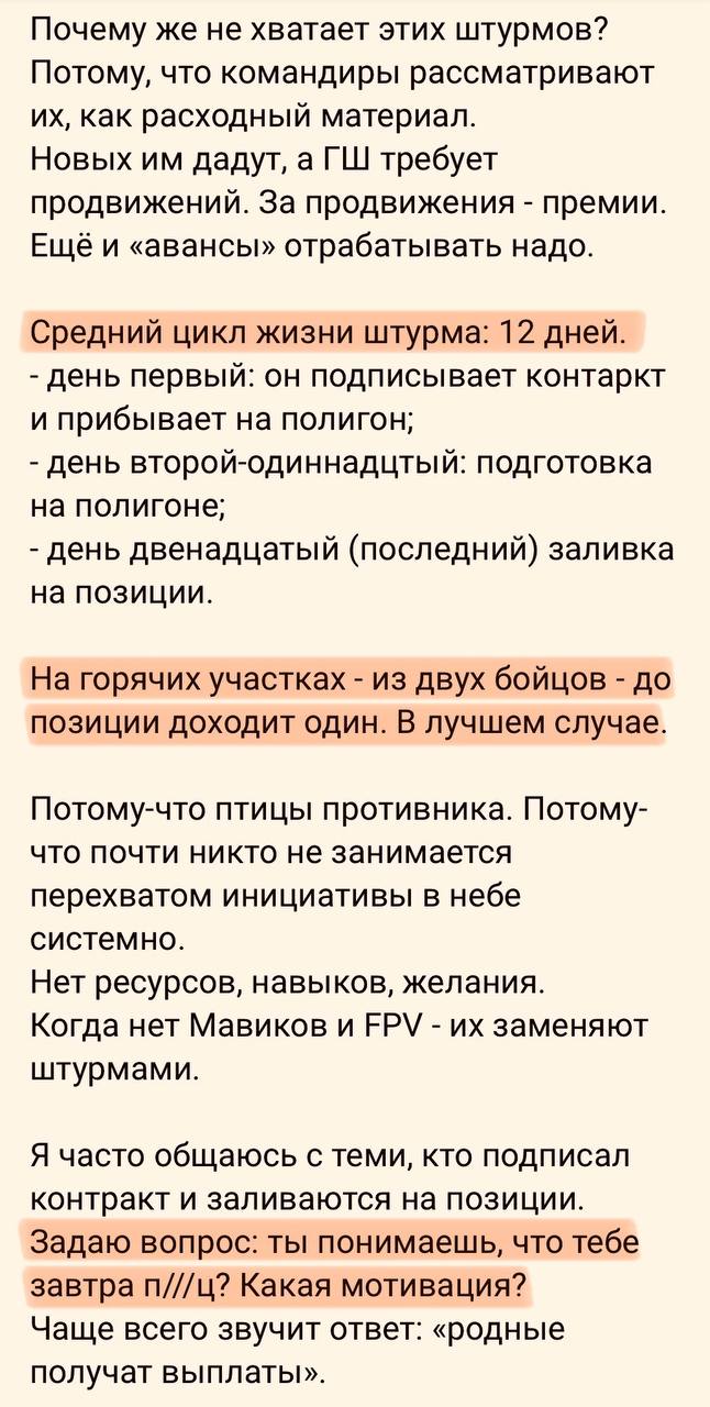 Російське командування розглядає штурмовиків як витратний матеріал, оскільки у Генштабі РФ вимагають просування і нових територіальних здобутків. Однак середній цикл життя російського штурмовика становить 12 днів.