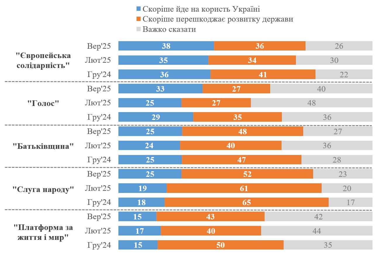 "Вважають корисною діяльність фракції "Батьківщини" – 25% (у лютому – 24%). Вважають, що діяльність фракції перешкоджає розвитку держави – 48% (у лютому – 40%). Подібні оцінки простежуються і у випадку фракції "Слуги народу", чию діяльність вважають корисною 25%, а 52% вважають такою, що перешкоджає розвитку держави. При цьому порівняно з лютим оцінка діяльності провладної фракції покращилася (з 19% до 25% стало більше тих, хто вважає її корисною для країни).