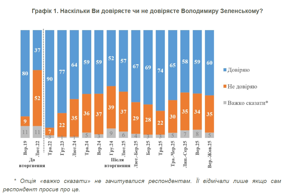 Президент України Володимир Зеленський зберігає стабільно високий рівень довіри серед українців - 60% громадян висловлюють йому підтримку, тоді як 35% не довіряють.