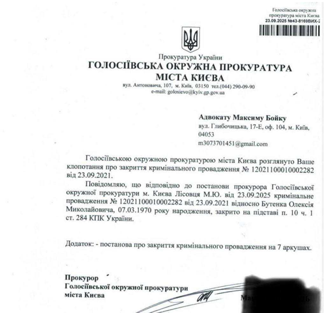 Кримінальне провадження від 23 вересня 2021 року офіційно закрито Голосіївською окружною прокуратурою міста Києва.