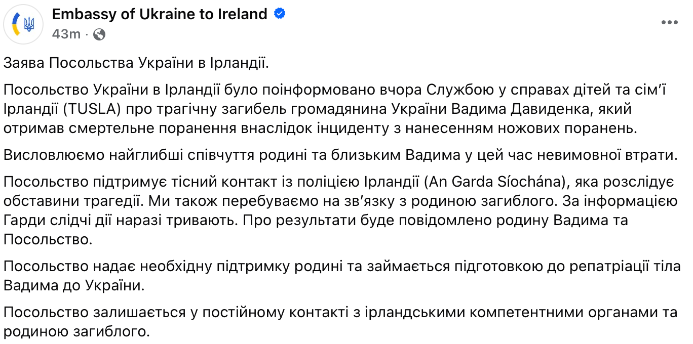 Посольство України в Ірландії підтвердило загибель у Дубліні громадянина України Вадима Давиденка, який дістав смертельне поранення через завдання ножових поранень.