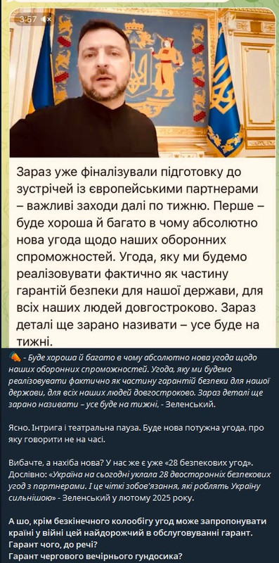 "Дуже важлива зустріч буде у нас в Британії. Але, безумовно, деякі партнери будуть офлайн, багато партнерів буде онлайн. Наша "Коаліція охочих", вона повинна фіналізувати, як можна швидше, гарантії безпеки для України", - сказав Зеленський.