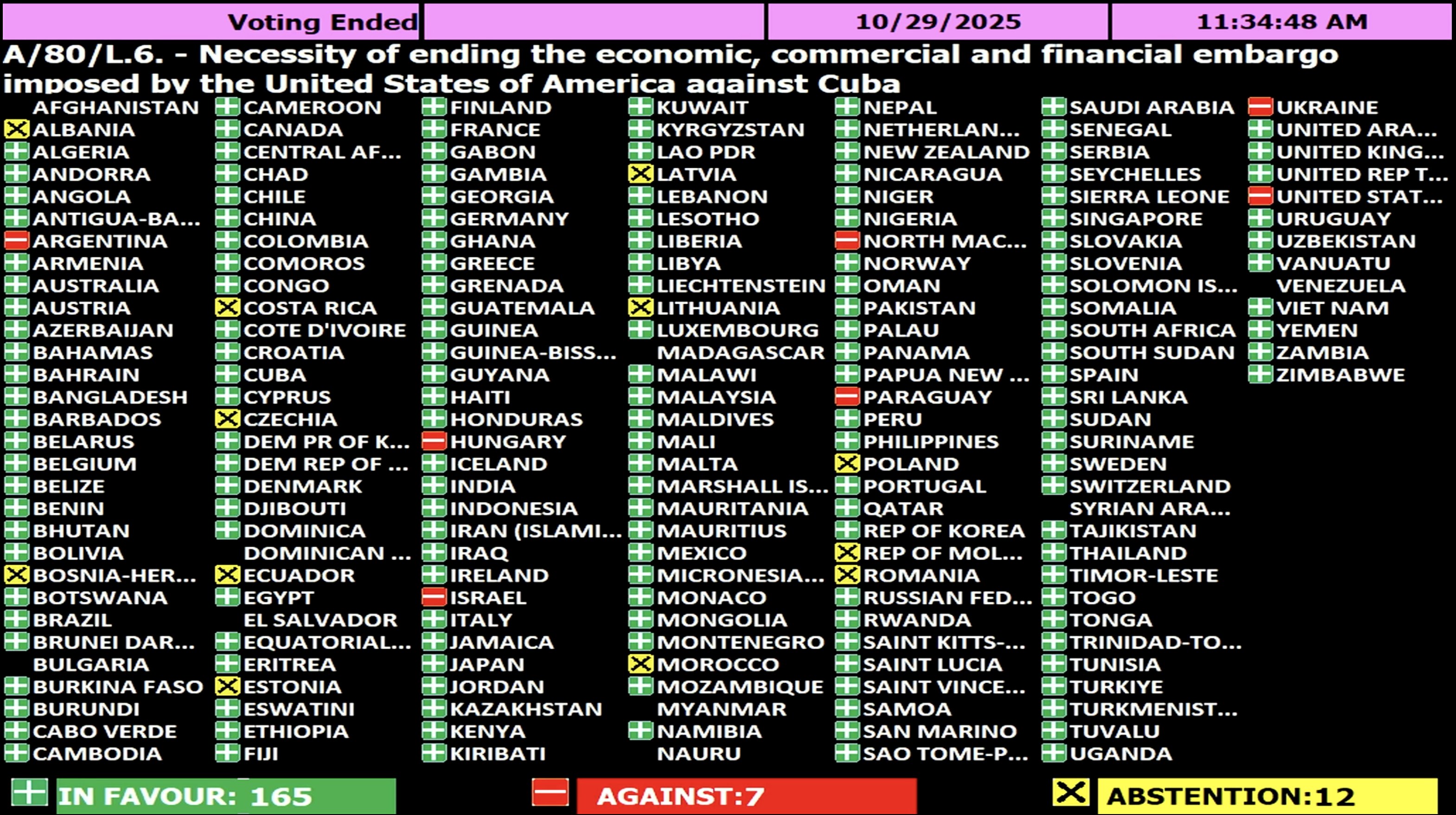 Усього 7 країн проголосували проти зняття ембарго з Куби. Це США, Україна, Аргентина, Угорщина, Ізраїль, Парагвай та Північна Македонія. 165 країн проголосували за резолюцію про зняття ембарго, 12 — утримались.