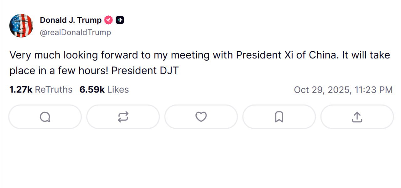 "З нетерпінням чекаю на зустріч з президентом Китаю Сі. Вона відбудеться за кілька годин", — зазначив Трамп.