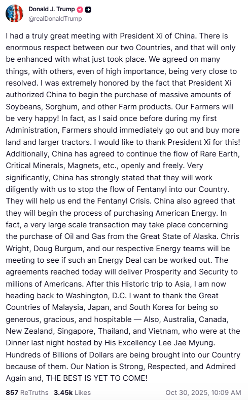 Зокрема, Пекін почне закупівлю сої, сорго та іншої сільськогосподарської продукції у США та продовжить постачання рідкоземельних елементів, критично важливих мінералів, магнітів тощо.