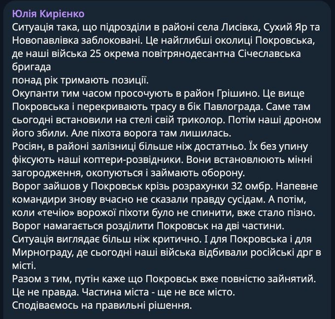 - 30 жовтня Сирський спростував гучні заяви РФ про начебто "блокування" ЗСУ в Покровську та Куп'янську.